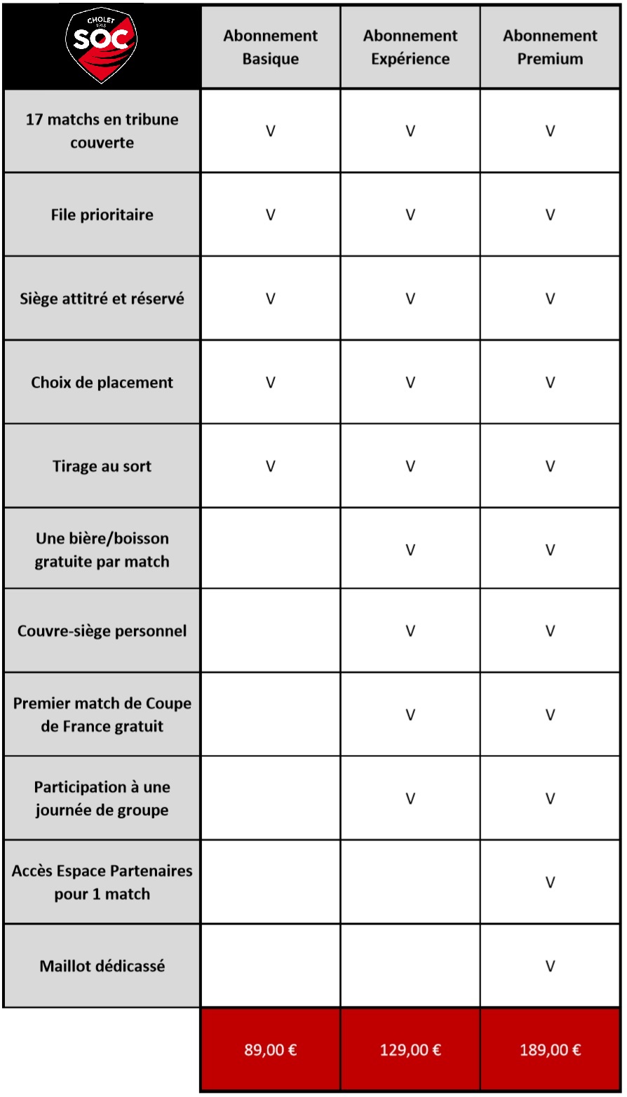 - Accro au SOC ? Nous avons pensé à vous ! Pour 189€, l’Abonnement Premium rassemble tous les avantages précédemment cités, ainsi qu’un maillot dédicacé par tous les joueurs et le staff. De plus, vous aurez la possibilité d’accéder à l’Espace Partenaires lors d’un match préalablement défini : rencontre avec les partenaires et les joueurs, buffet et boissons à volonté servis par des hôtesses, découvrez l’aspect VIP du SO Cholet !